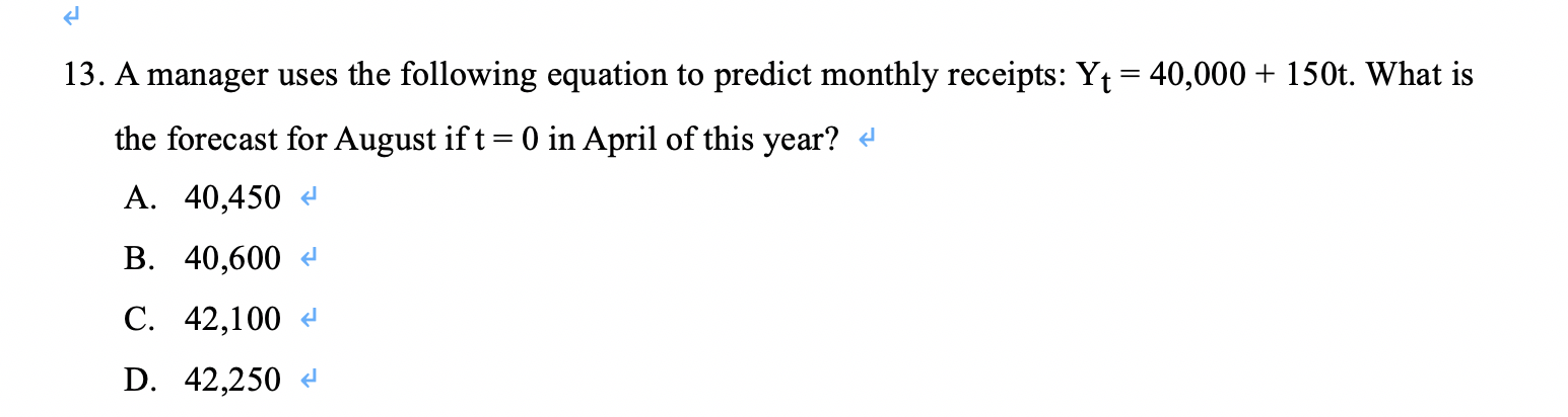 In trend-adjusted exponential smoothing the trend-adjusted forecast consists of. A manager uses the following equation to predict monthly receipts. A manager uses the following equation to predict monthly receipts Y t 40000 150t from MGMT 330 at Indiana University Of Pennsylvania.