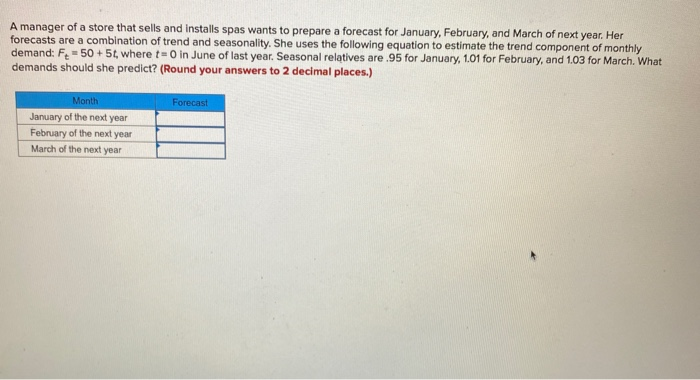 What is the forecast for July if t0 in April of this year. What is the forecast for July ifto in May of this year. Answer of A manager uses the following equation to predict monthly sales.
